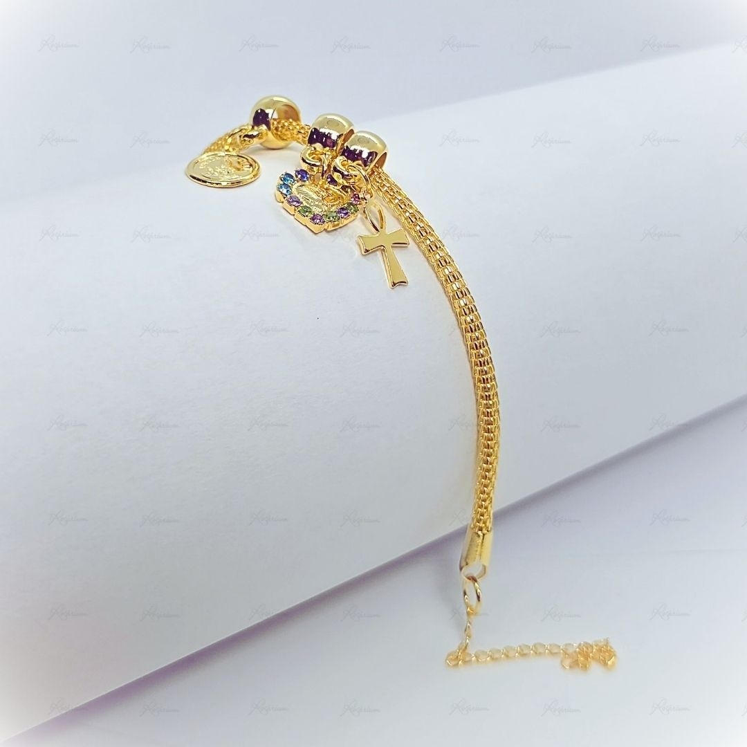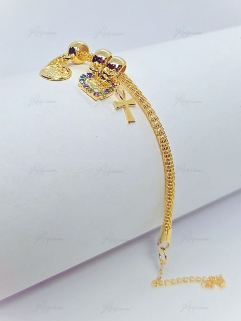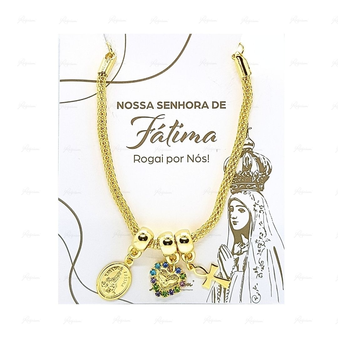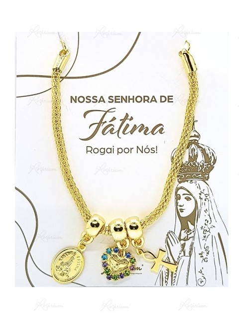 Pulseira Banhada a Ouro 18K c/Medalha, Coração e Cruz c/ Aparição de Fátima