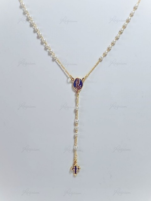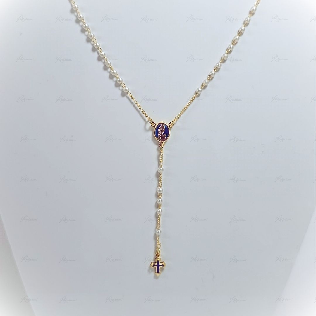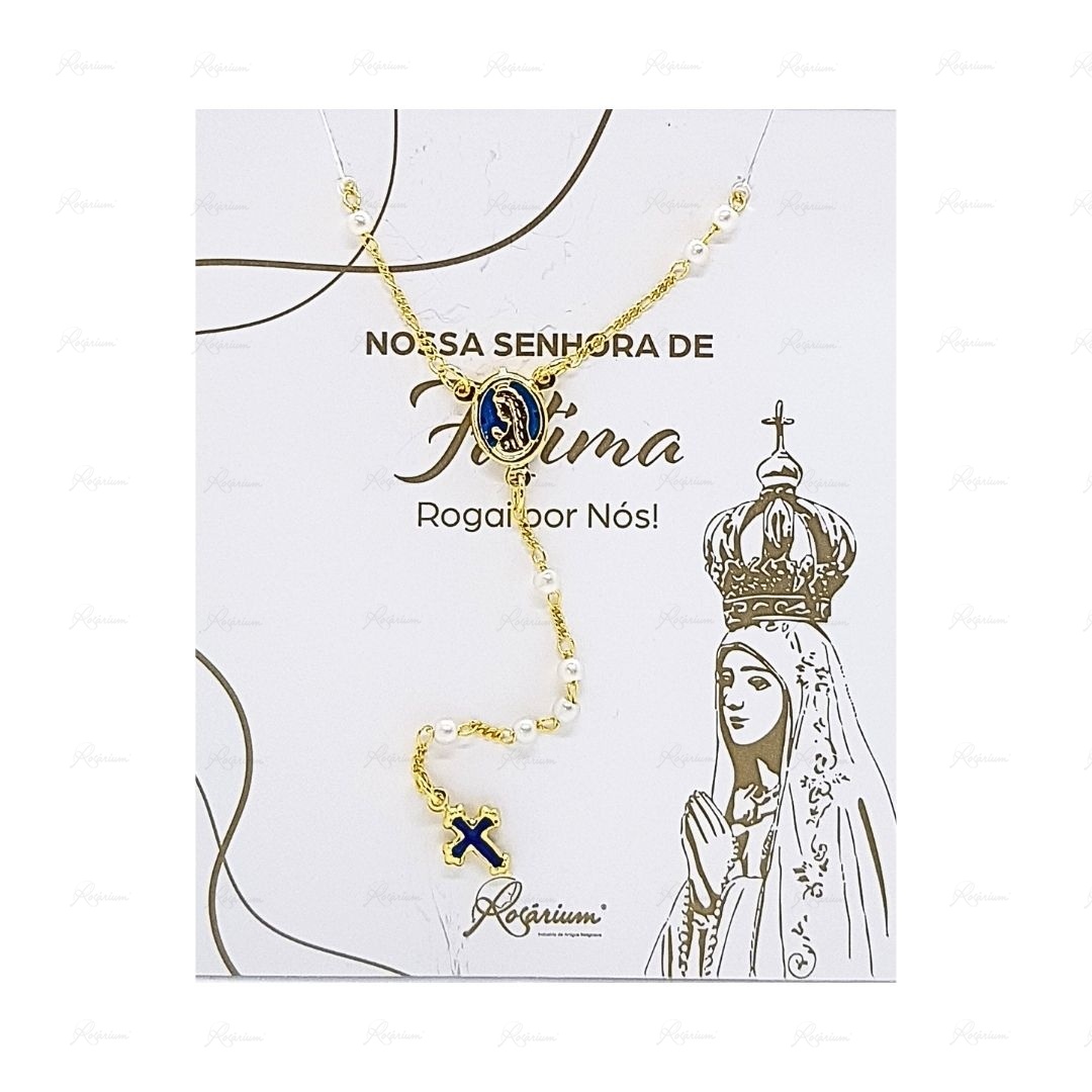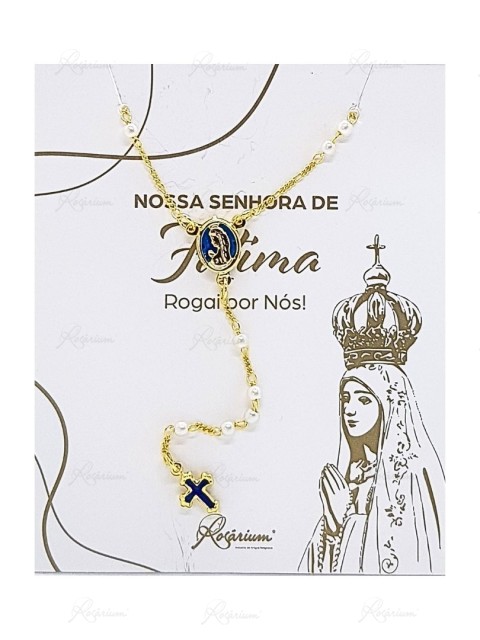 Terço Banhado a Ouro 18K c/Pérolas 2MM c/Passador e Cruz em Resina Azul - Fátima