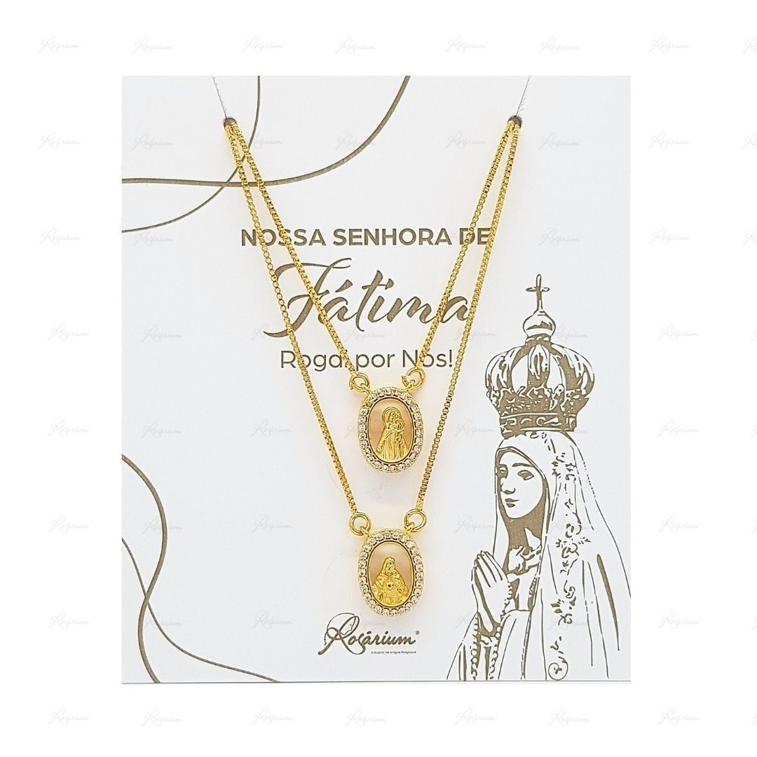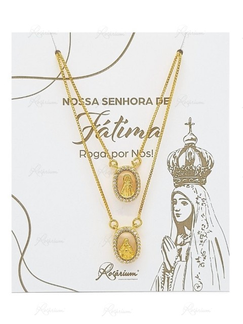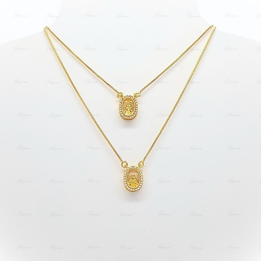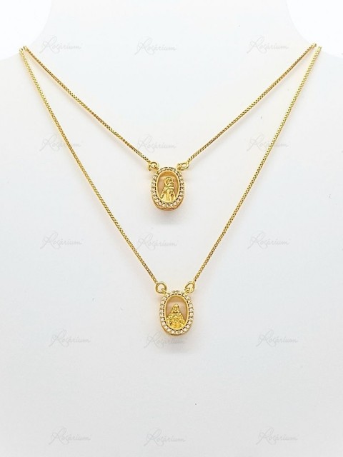 Fio Escapulário Banhado a Ouro 18K c/Zircónias e Imagens Recortadas - Nossa Senhora do Carmo e Sagrado Coração de Jesus