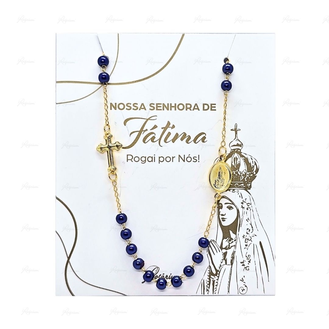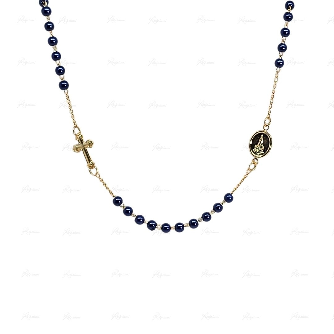 Terço Banhado a Ouro 18K c/contas de Pérolas Azuis 4MM - Fátima